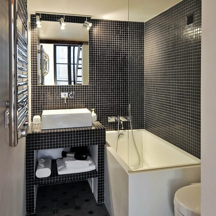 This bathroom uses mosaic black tiles on the walls and vanity. However, it still looks perfect.