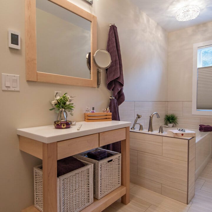 As for the traditional look, you can try investing in a wooden vanity. You can also use shiplap wood paneling to cover the ceiling.