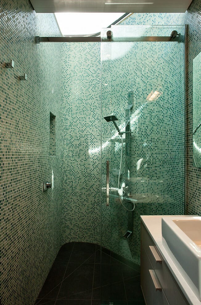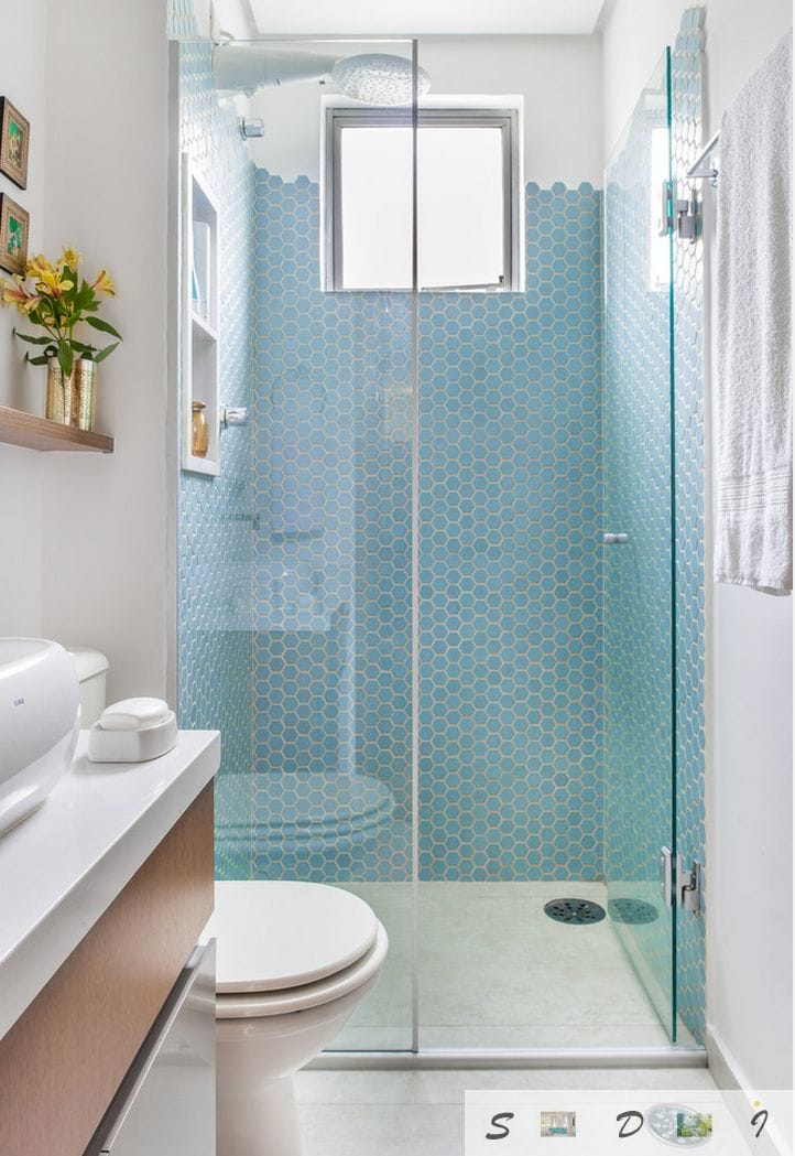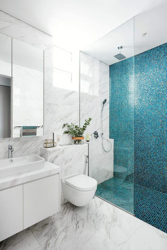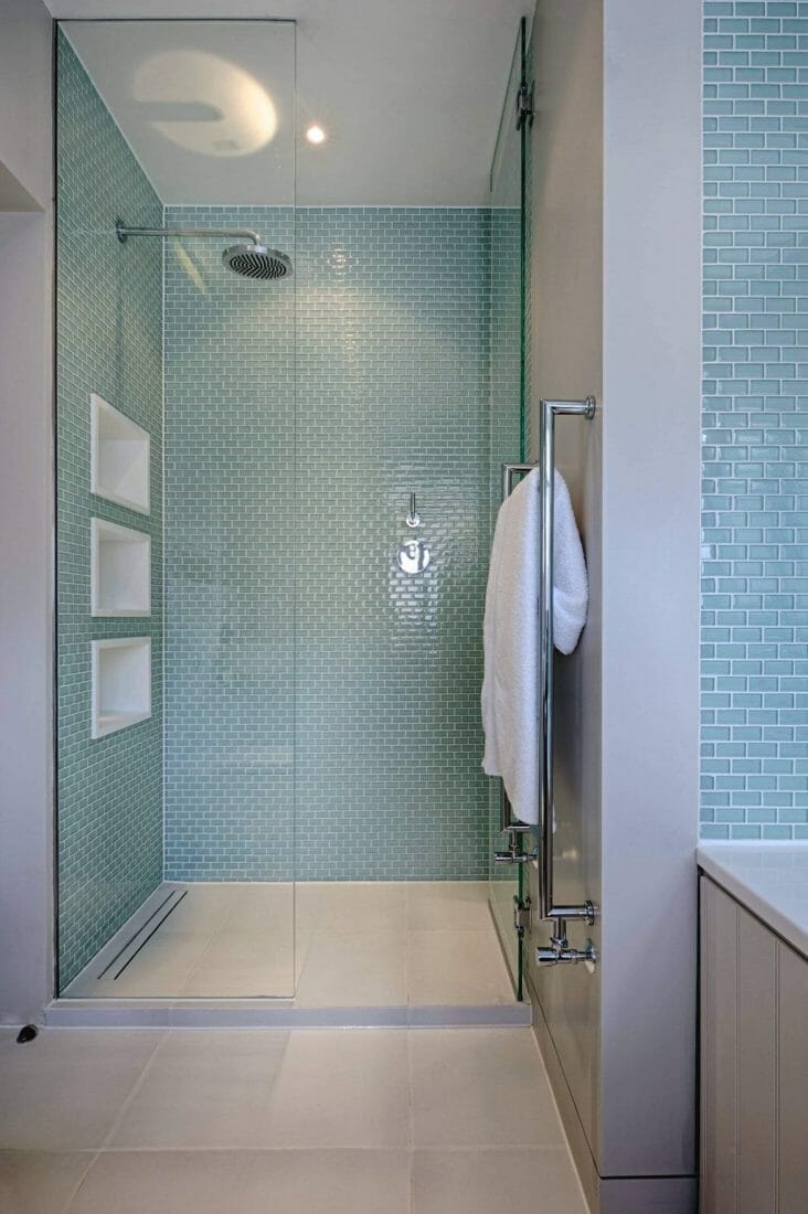 Bright small tiled shower ideas are the ultimate strategy to bring a seaside vibe to your modern bathroom, especially those that adopt pastel blue tiles.