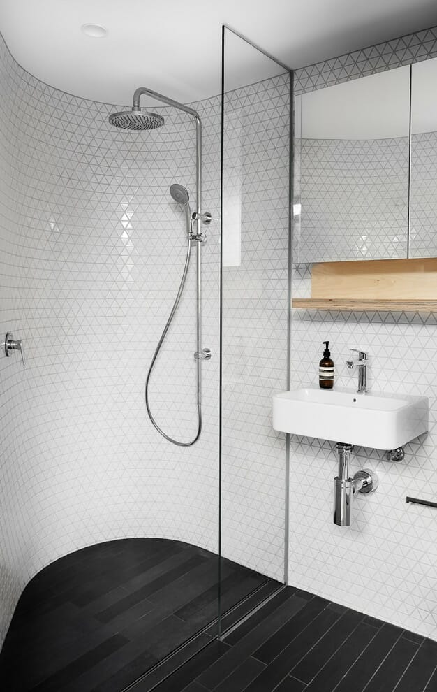 3. White Triangle Tiles on The Wall and Porcelain Plank Floor in Black