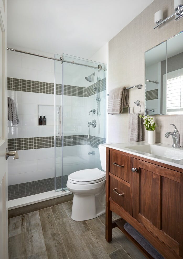 Among many small tiled shower ideas, one with accented ceramic tiles representing wood structure on the wall is such a smart move to give a pop of texture to your small bathroom.