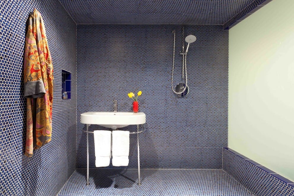 Blue mosaic tiles can make your small bathroom look darker. However, that will not happen anymore if you equip it with a window next to the shower space to let natural light in during the day.