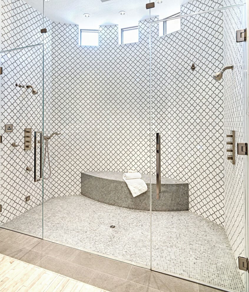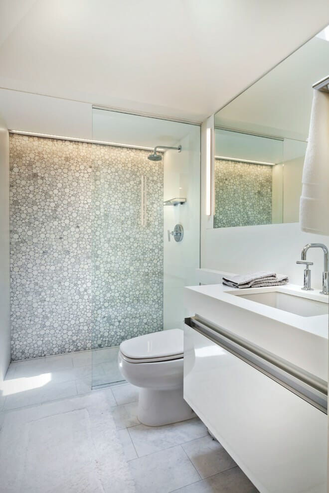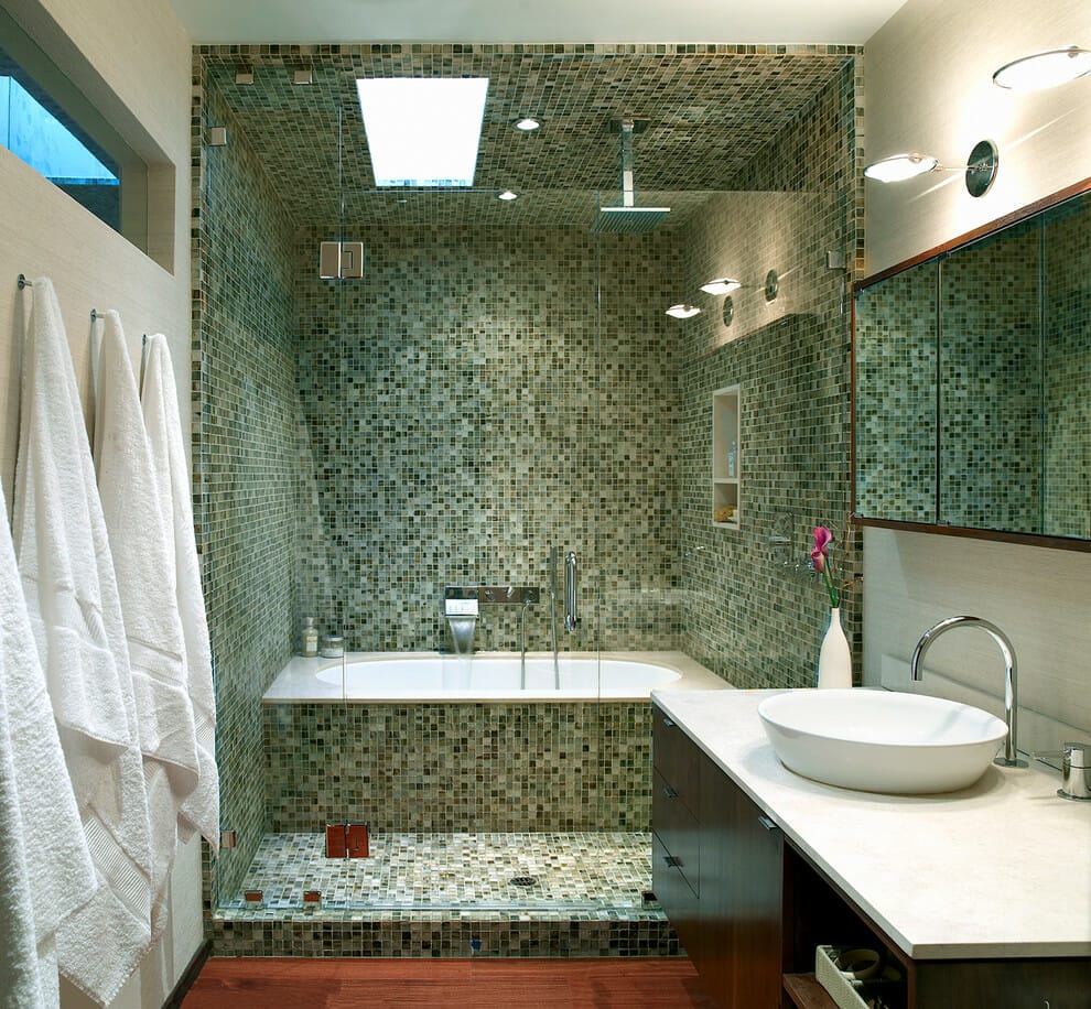 Moreover, you can add patterns on the flooring with mosaic tiles in the same tone. To make it look cleaner and sleeker, complement this design with glass partitions and a white ceiling.
