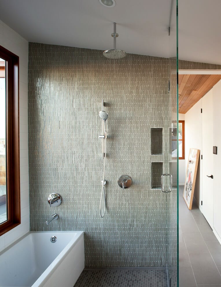 Meanwhile, a single built-in shelf under the shower will be handy for storing your bath utilities so that everything is within reach.