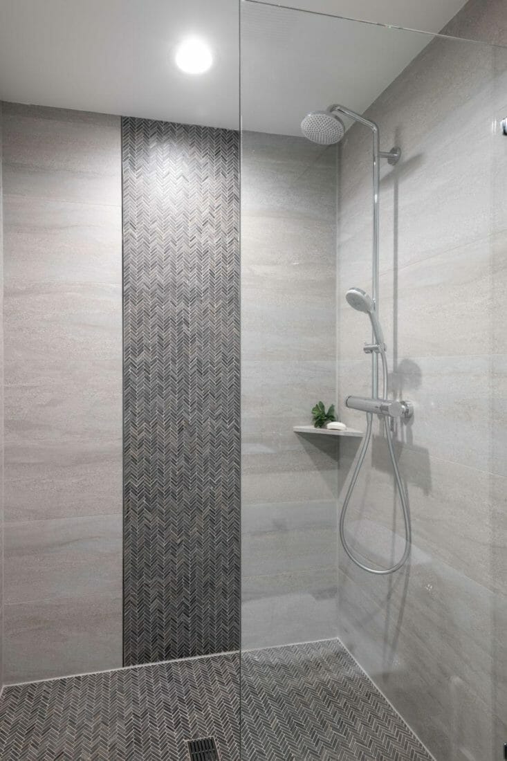 Small tiled shower ideas with tiny chevron tiles in gray tones will be enough to give a distinctive personality to your small bathroom.