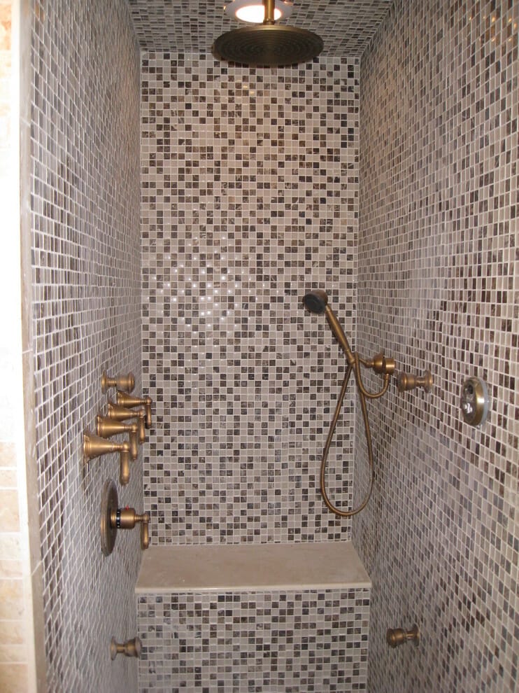 Mosaic tiles become the star among the many small tiled shower ideas in this article.