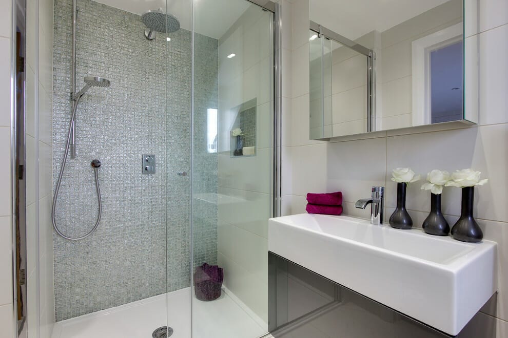 This idea discusses decorating the inside and outside parts of the shower enclosure. Presenting small tiles in these two areas will not make your bathroom look cramped as long as they do not come in a bold tone.