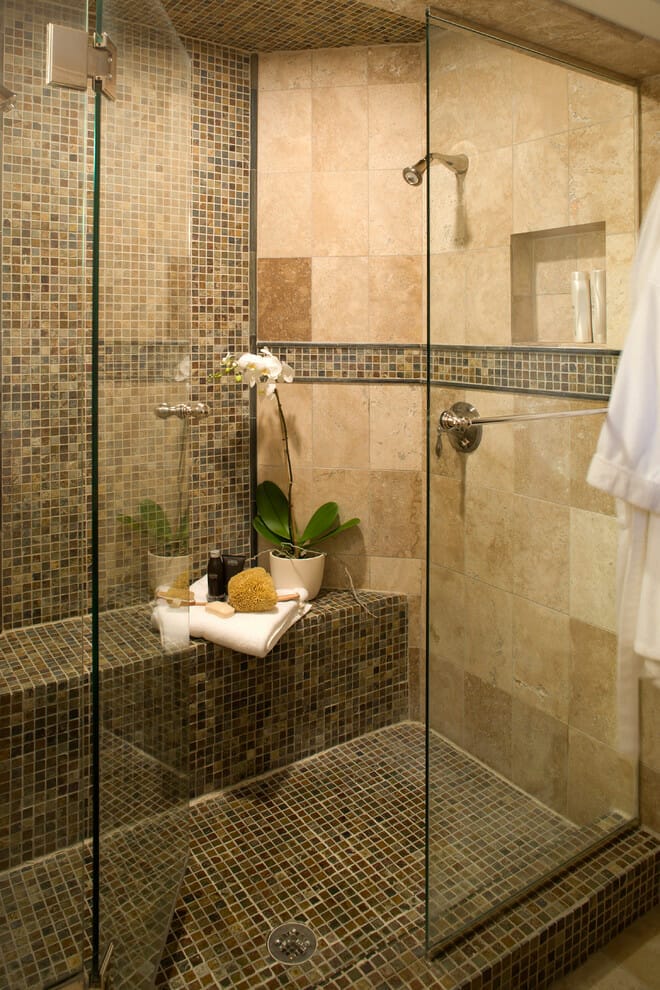 Add drama to the spot by combining plain ceramic tiles with mosaic ones on the walls, floors, and the built-in bench.
