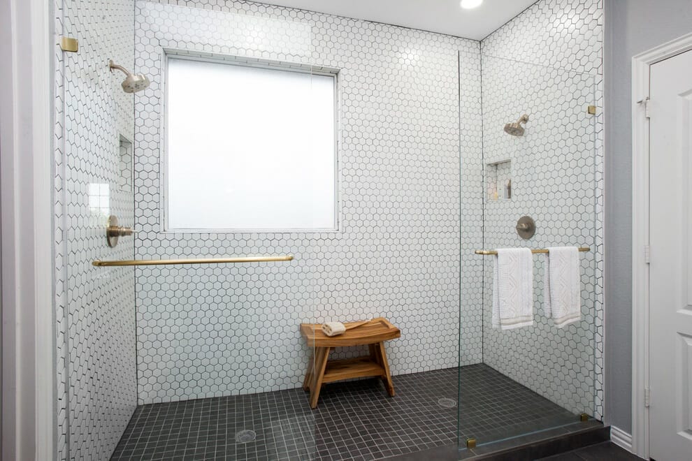 Set the walls and ceiling of your walk-in shower with ceramic tiles in rectangular shapes and hexagonal tiles in black and white for the flooring.