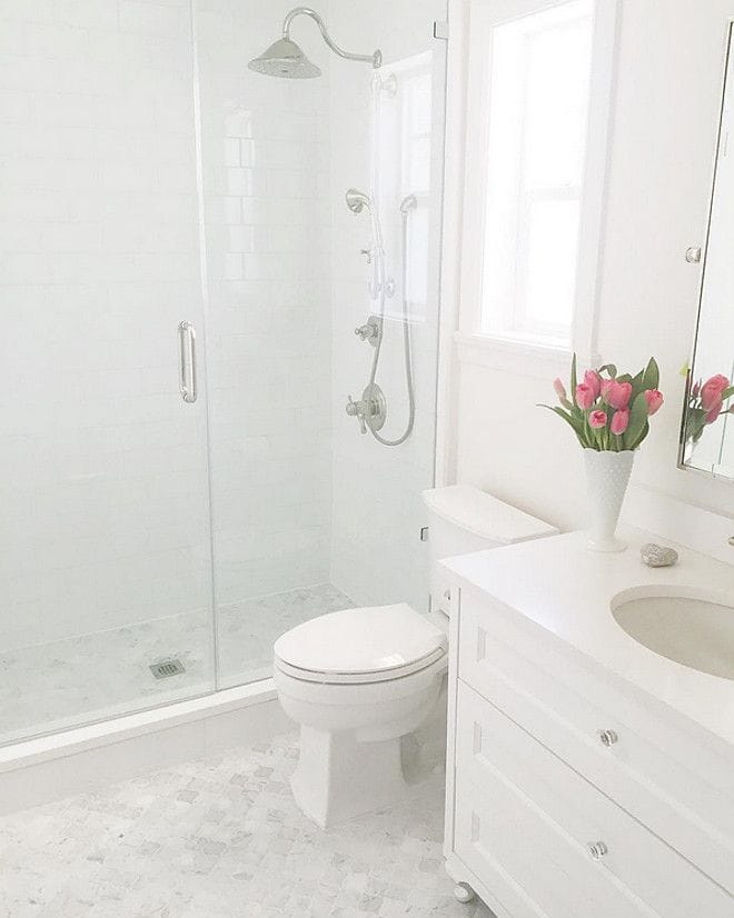 As seen in the image, subway and hexagon tiles come in pure white. Not only do they visually expand the bathroom but they also offer character.