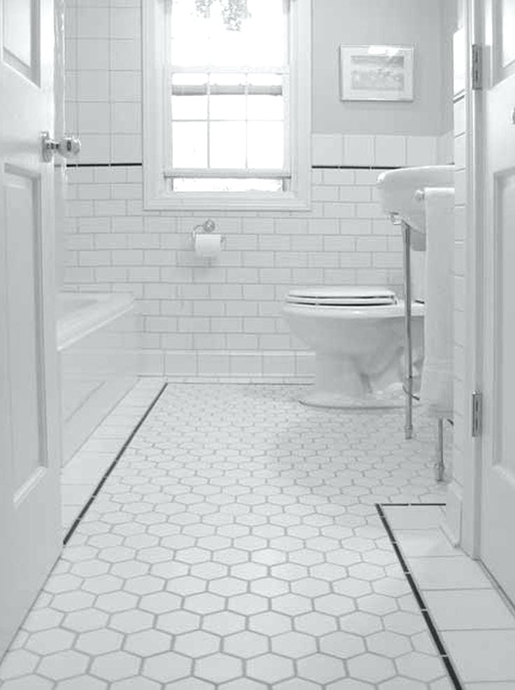 White rectangular and hexagon tiles gather in this bathroom. They bring depth and visual appeal to the interior. Console vanity from Lowes and tissue holder both carve a vintage feel.