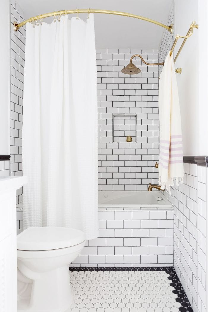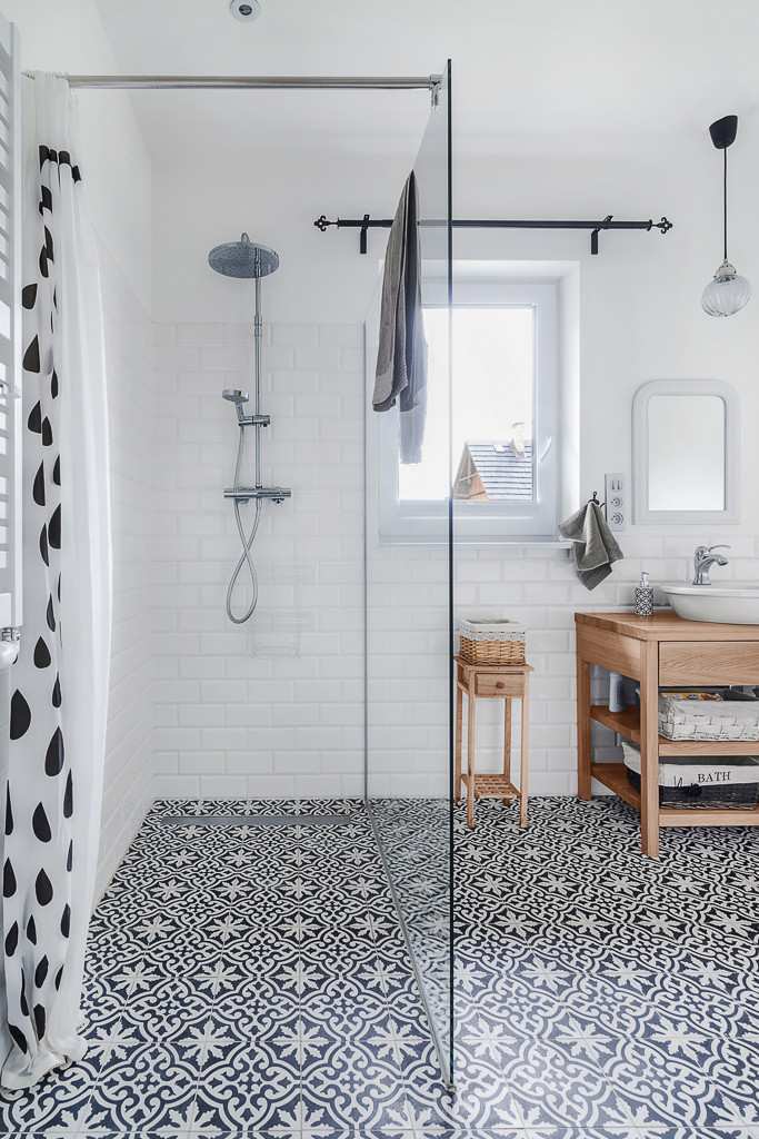 Both white subway tiles and grout lines create a seamless look. The patterned floor tiles set Moroccan vibes.