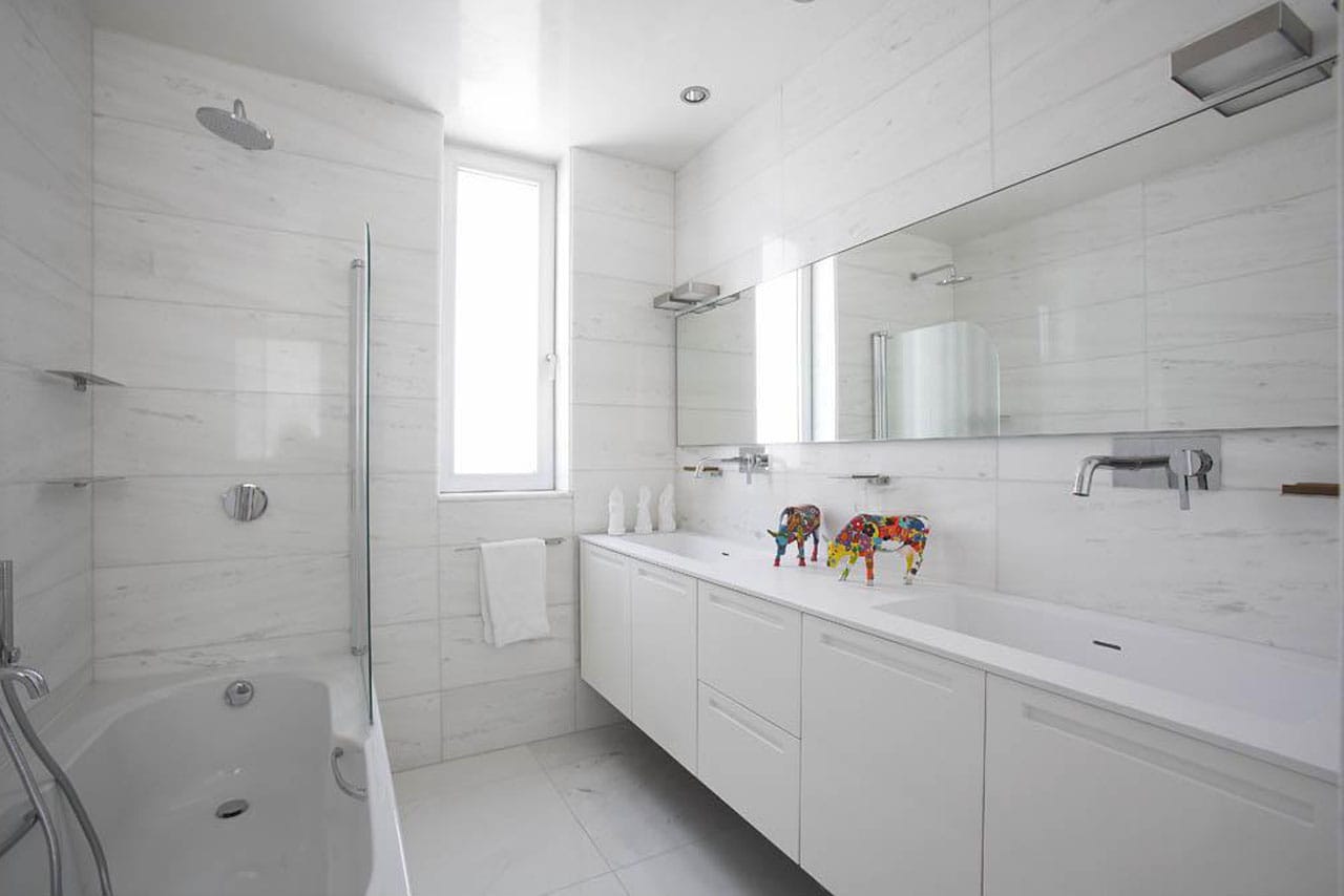 Here, off-white polished porcelain tiles exude the feelings of softness and luxury. Windows allow the sunlight to enter the bathroom.
