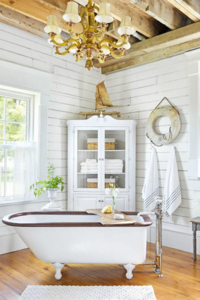 White corner display cabinet, roll-top bath and shiplap walls reinsure the space with country charm. Double-hung windows add lots of sunlight to the area.