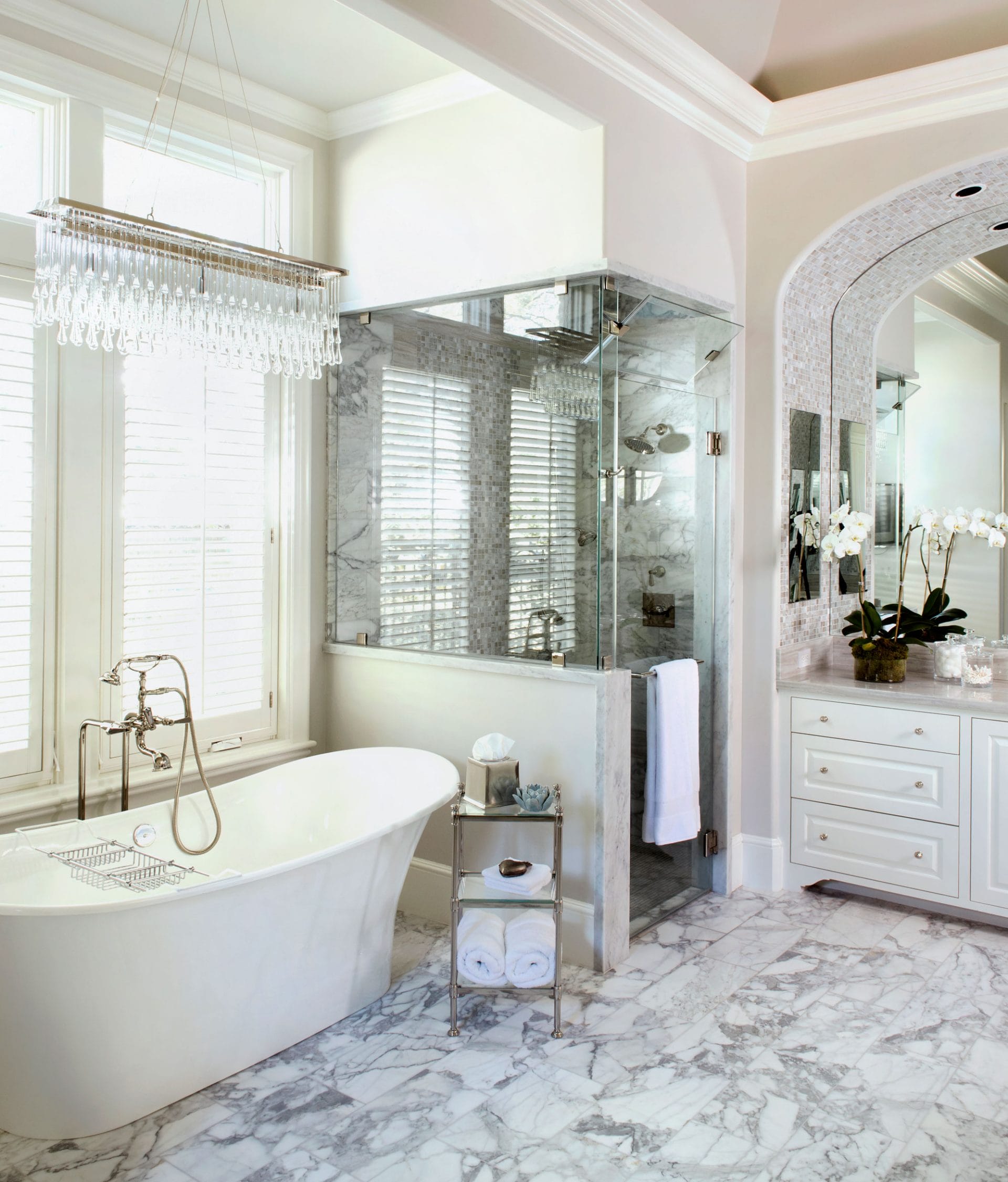 The arched wall, oval tub, and fittings lend the bathroom a classic appeal. Glass shower enclosure and wide pendant chandelier emanate a modern vibe.