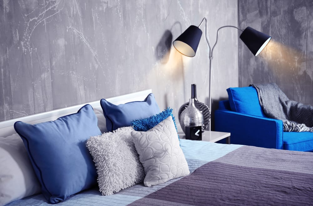 Concrete walls inject the industrial charm into this modern sleeping zone. Blue throw pillows and armchair refresh the area.