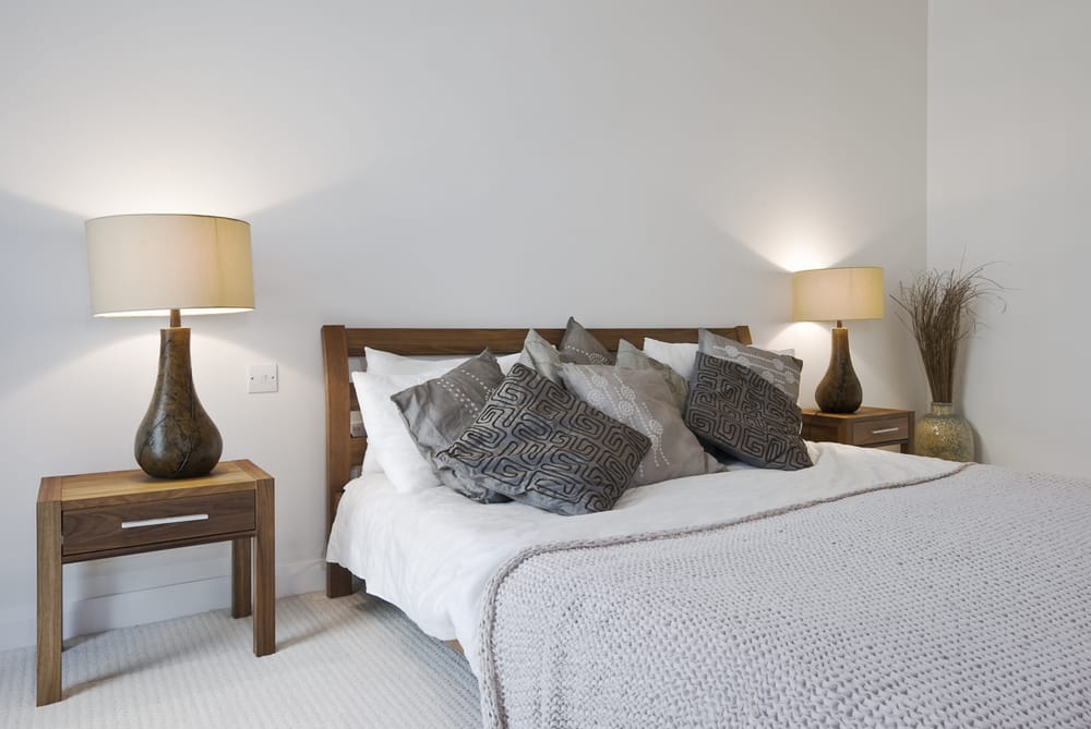 This bedroom boasts two stylish table lamps. They produce a warm light during the night.