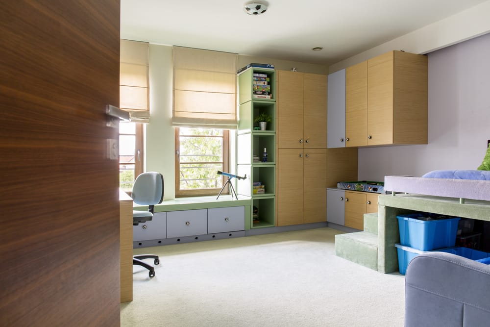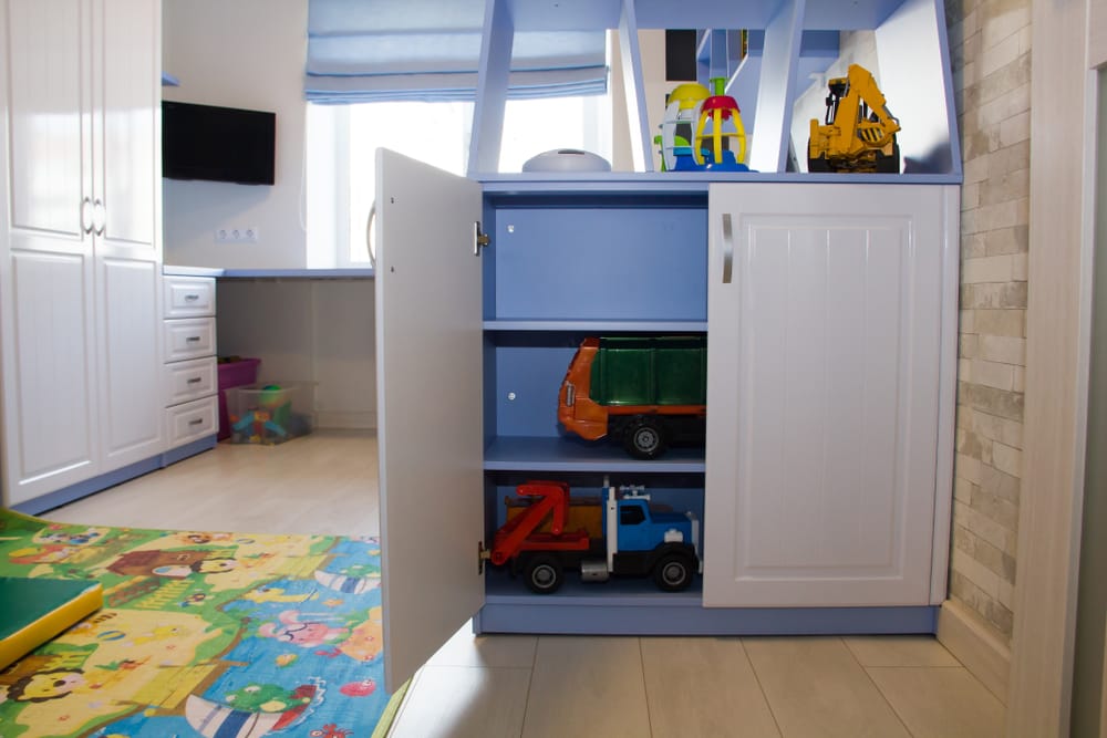 Here, the white-and-blue cabinets house children’s playthings. They effectively enlarge the space and remove unwanted clutter.
