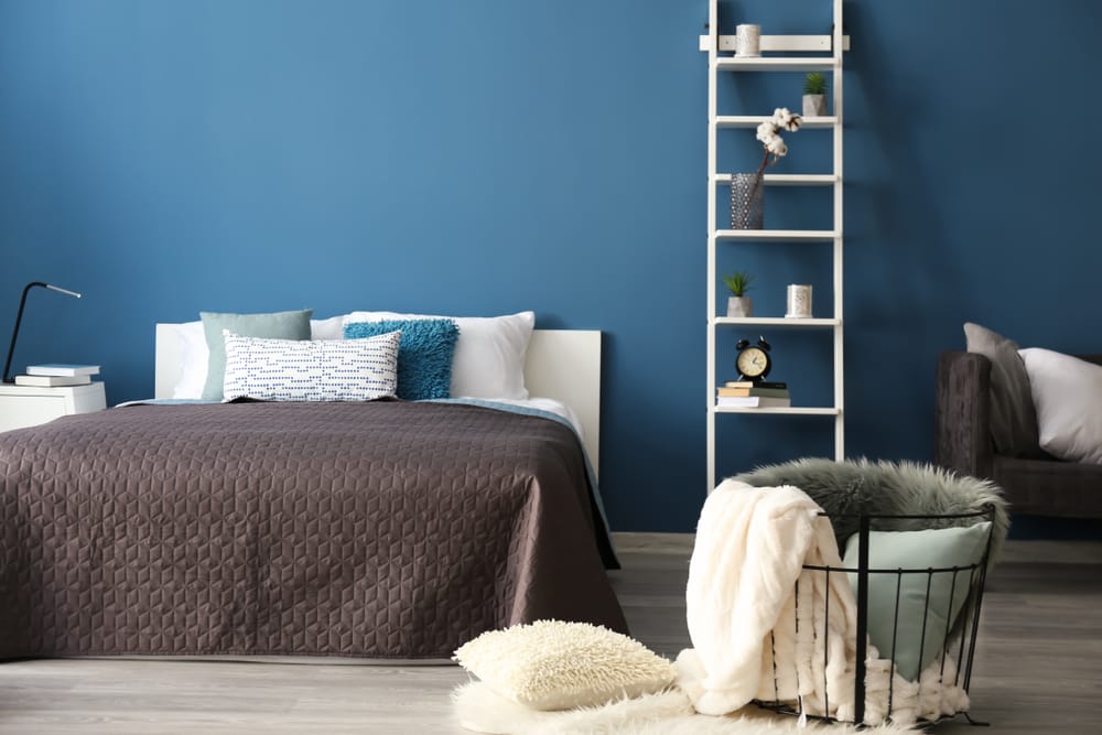 You could paint the ladder white. It nicely contrasts with the blue wall. Meanwhile, black metal basket holds fluffy blankets and throws.