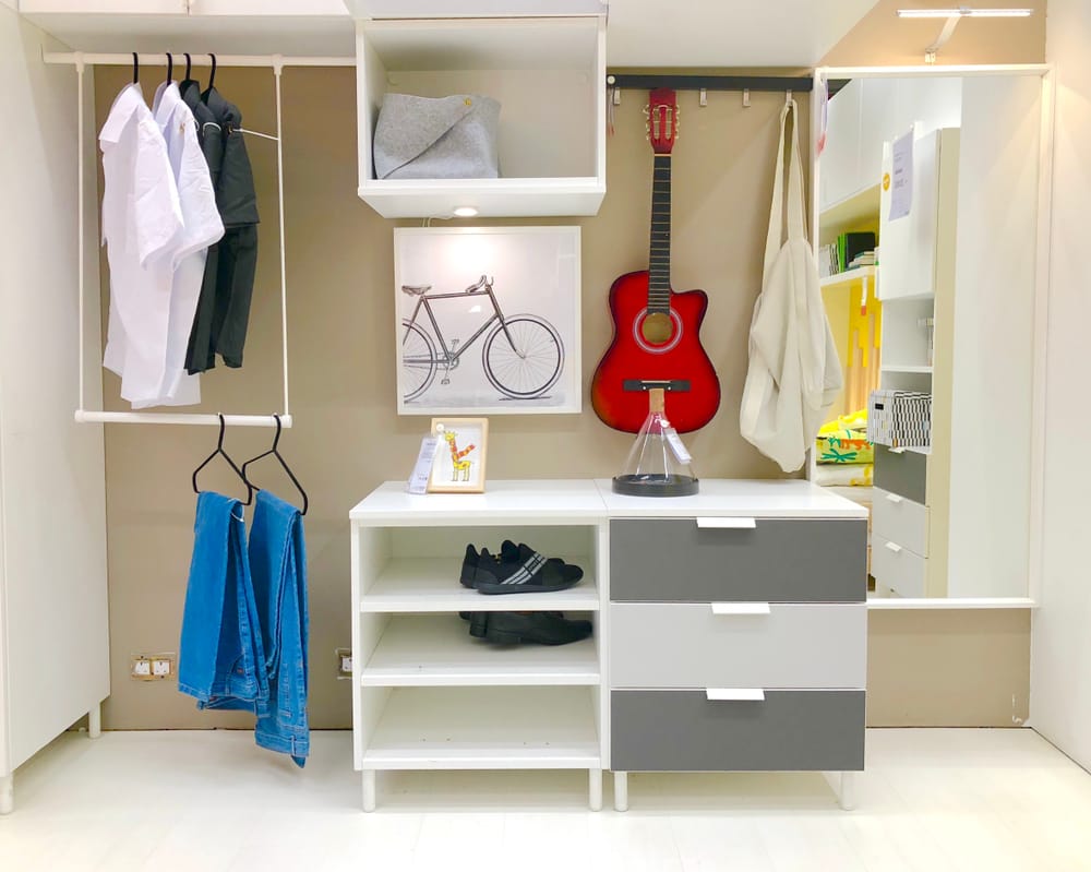 Create DIY hanging racks for clothes and spare towels. Combine them with wall-mounted hooks, open cabinets, and chest of drawers.