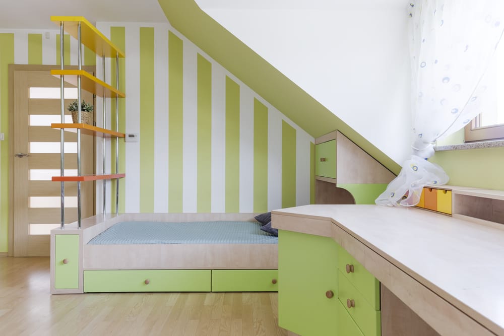 White adds a feeling of refinement and tranquility to this teenager’s bedroom. Lime green lends the sleeping zone a fun atmosphere.