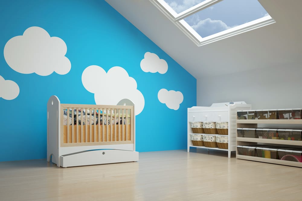 Your baby certainly feels lucky and welcome in this attic nursery. Cloud wall decals serve as a playful art piece.