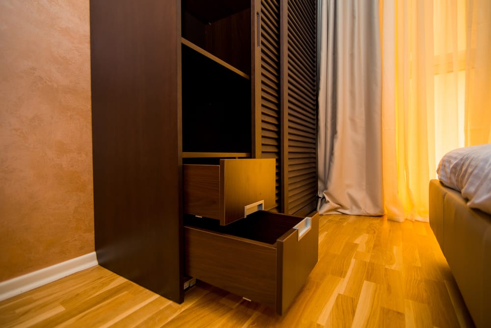 The dark wooden wardrobe includes sliding doors and pull-out drawers. Open shelves deliver style and gives tons of storage space.