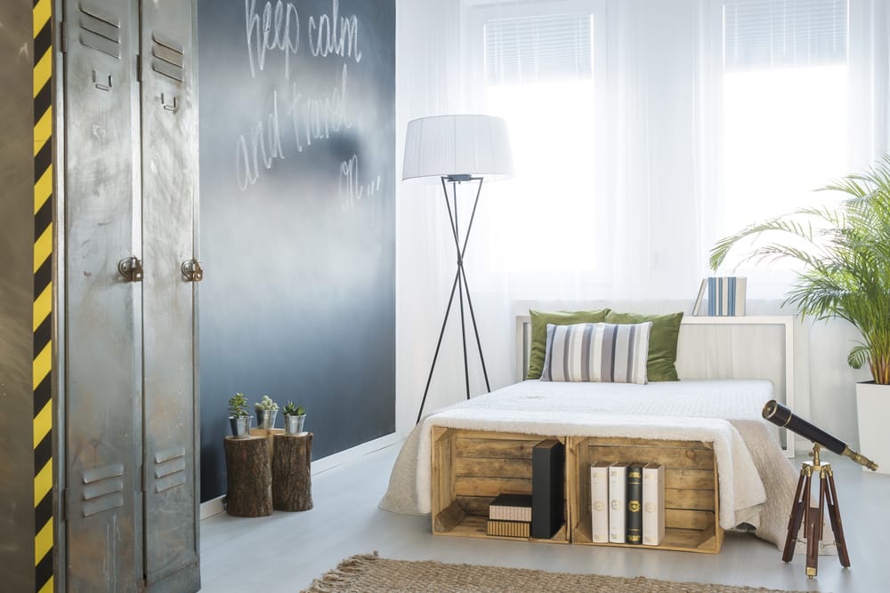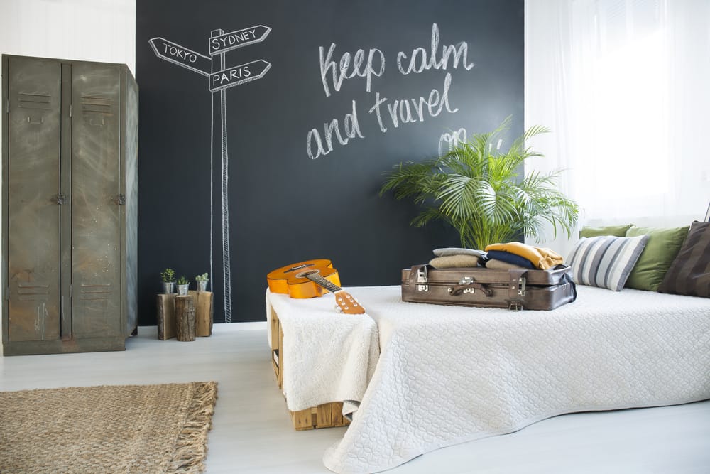 Then, include vintage suitcase and locker for a lived-in look. Lastly, put DIY touches on chalkboard wall.