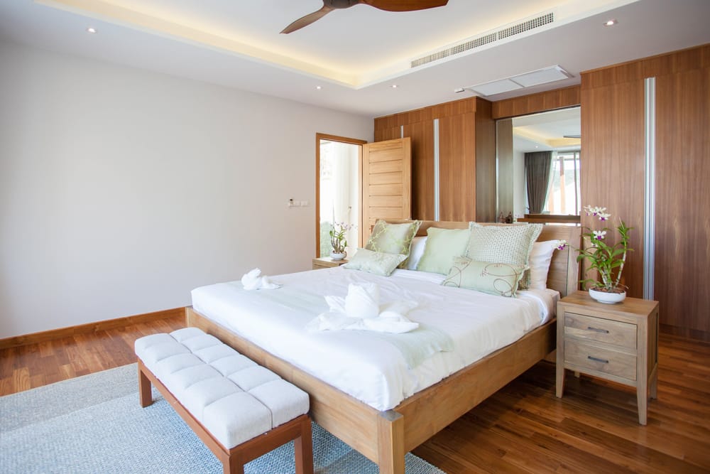 Dealing with a small bedroom? Worry not. Opt for neutral color scheme and raw wood furniture units to create an open, serene setting.
