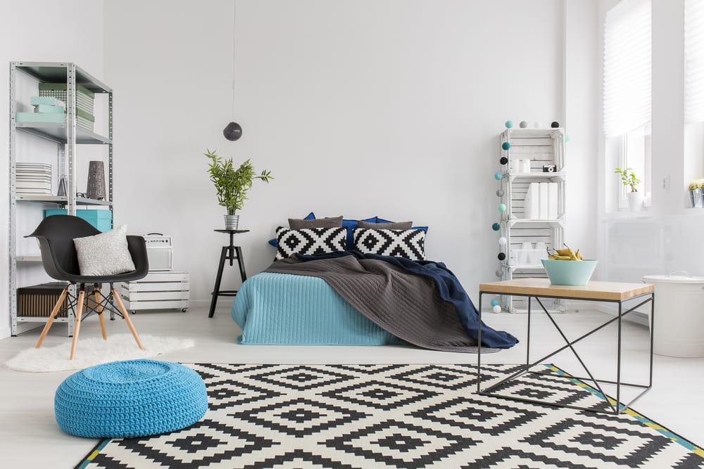Geometric patterns grab the attention without overwhelming the room. An explosion of turquoise keeps the area from becoming dull.