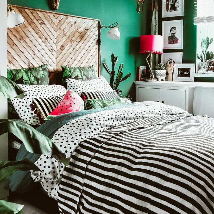 You can begin with painting the walls green for the base. Then, invest in botanical bedding or, at least, pillowcases. Wrap them all with lots of indoor plants for an instant forest themed bedroom.