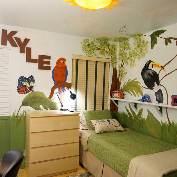 A forest themed bedroom is not always green. It can be as colorful and cheerful as the one in this picture.