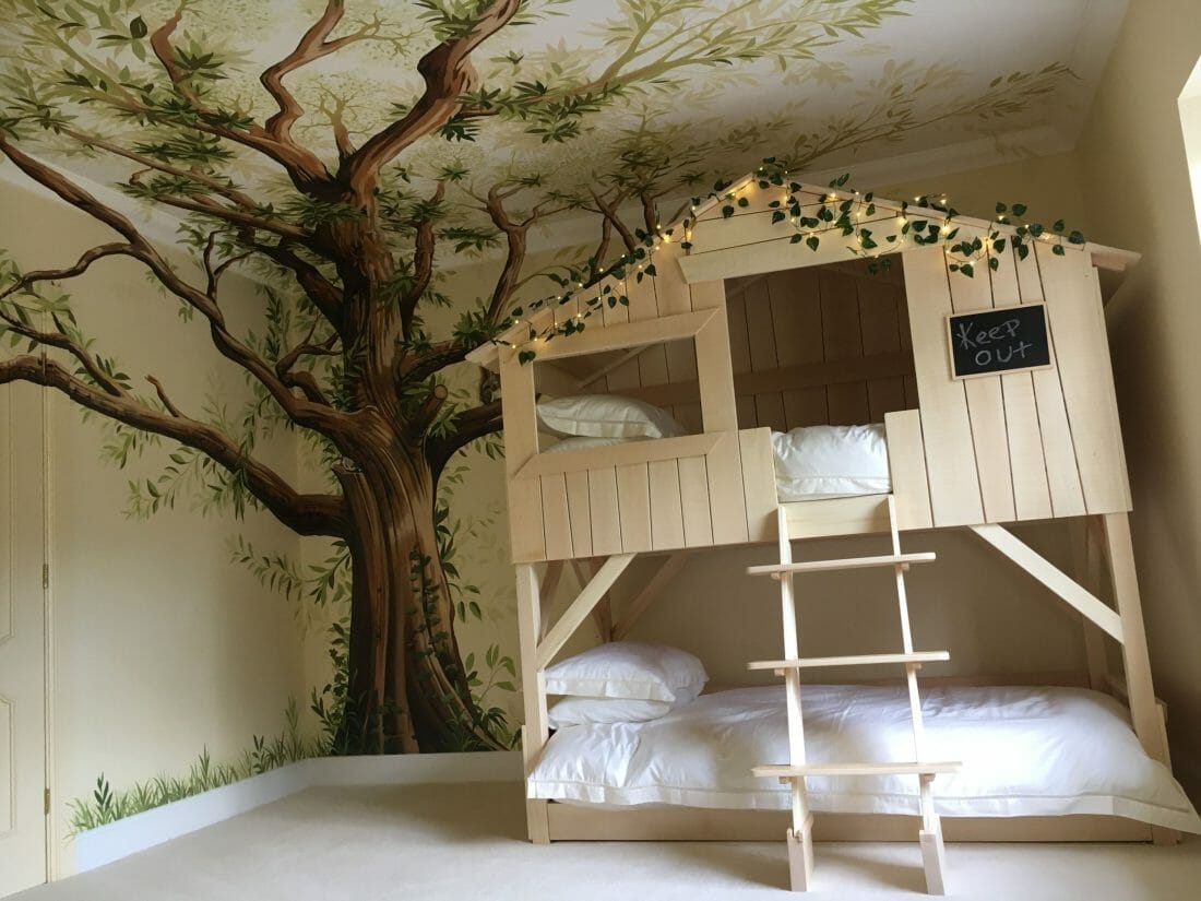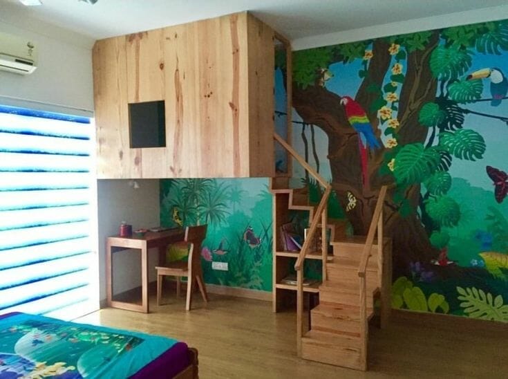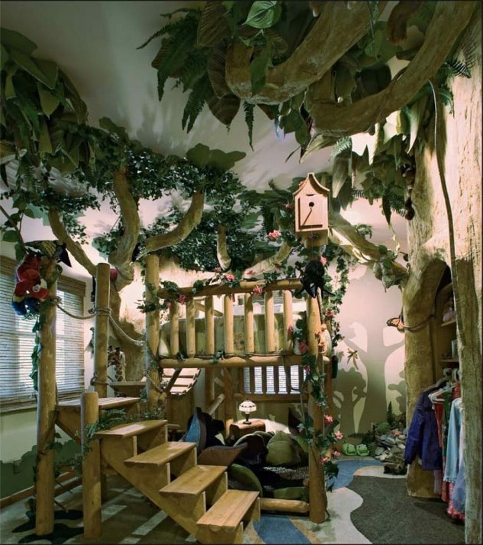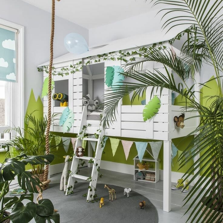 If your kid’s bedroom is spacious enough, you can adopt this idea. Use faux vining plants to decorate the stair and ceiling.