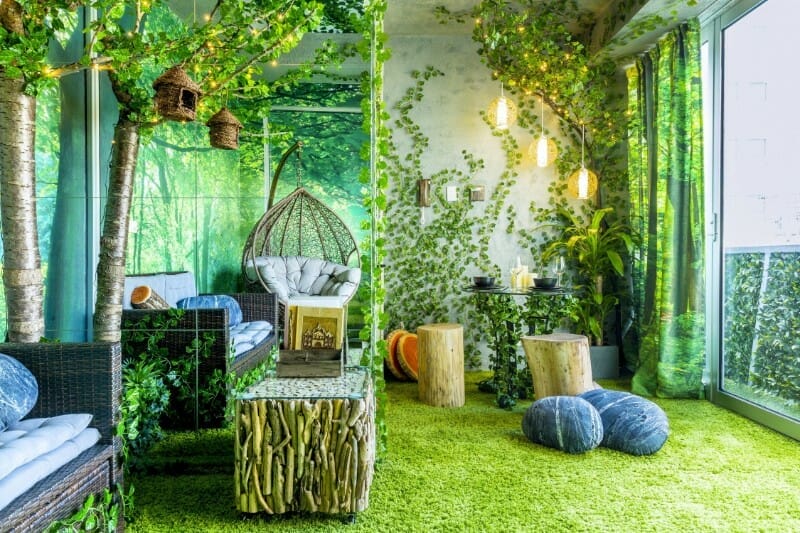 Instead of filling the space with vines and faux trees, you can just decorate the wall with a wall decal. Of course, it has to be green.