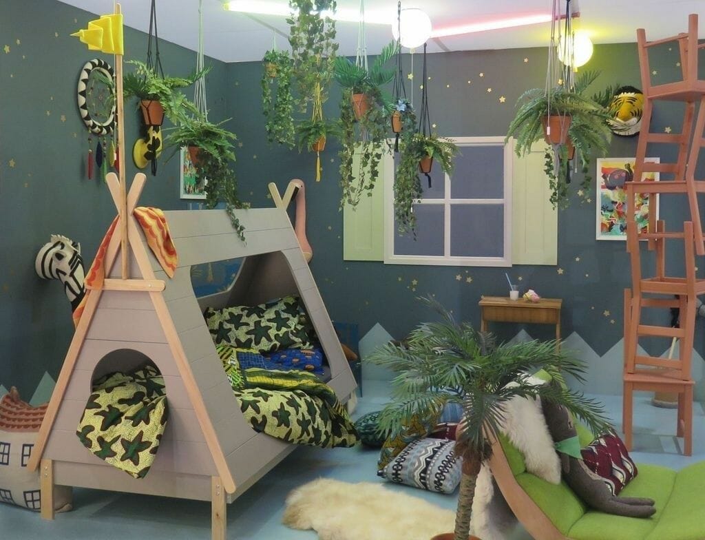 Well, if you cannot send him there, you can bring the camp to his bedroom. Simply purchase a teepee-tent bed frame. Then, add some potted plants dangling from the roof.