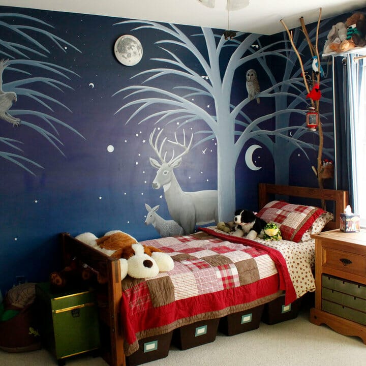 You just need to paint your walls dark blue like the night sky. Then, add some trees and animals along with a beautiful moon.