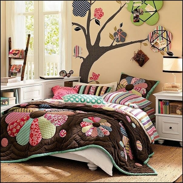 Who says a forest theme cannot be cute? This bedroom shows that it can be playful and DIY friendly. You can even make the flower patterns from patchwork.