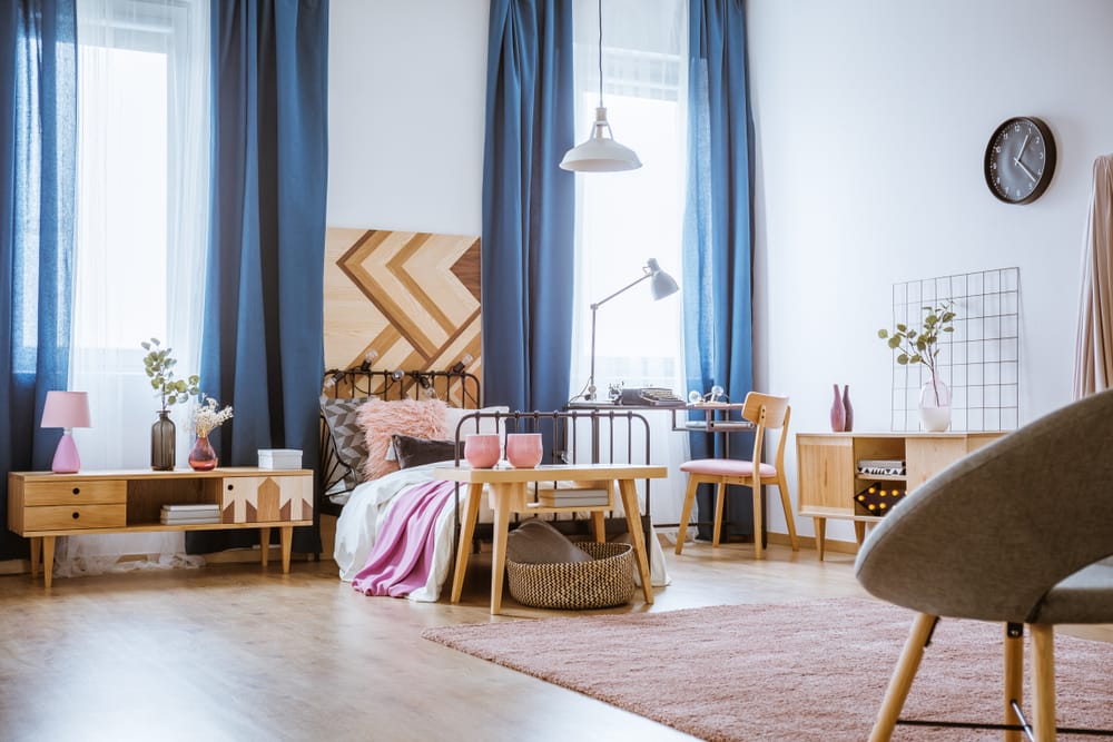 Various pink shades develop a lovely scene. Floor-to-ceiling blue curtains keep the space from feeling too girly.