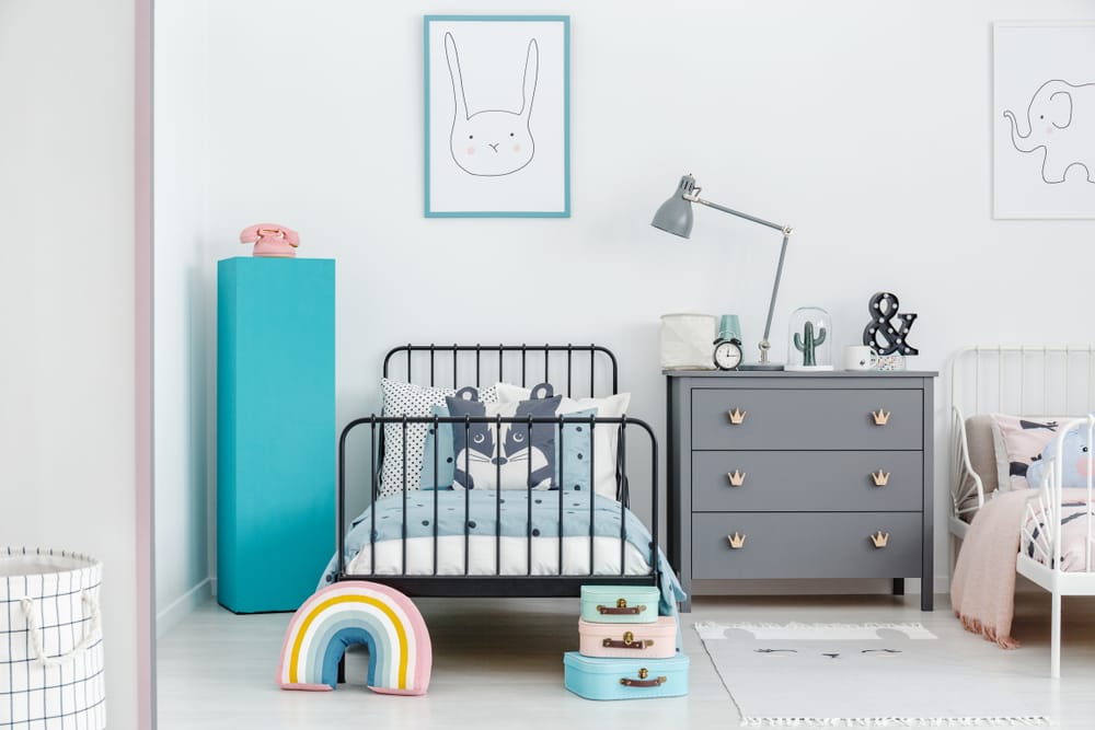 Rainbow throw pillow, tall stand, toy telephone, beddings, and mini trunks give the room bursts of colors. Crown knobs and quirky artworks adorn the space.