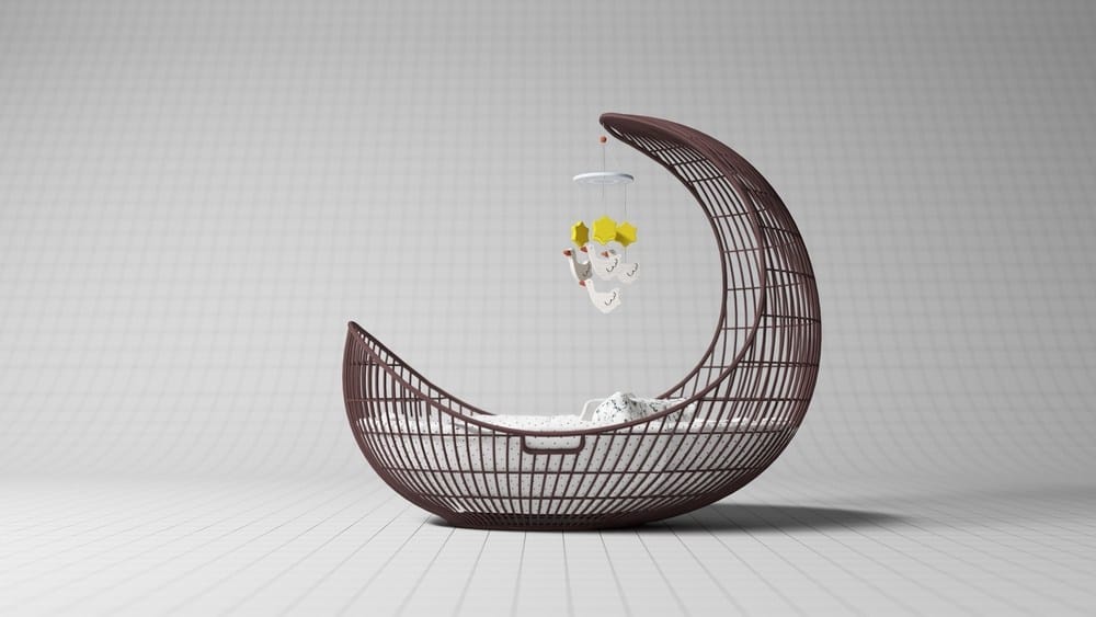 Moreover, moon-shaped baby crib comes in dark brown. It develops a marvelous contrast. And the paper bird mobile adds a pop of vivid color to the area.
