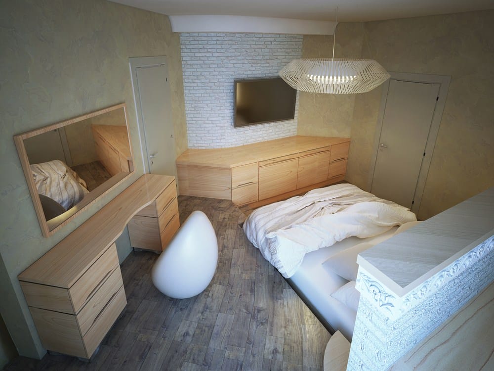 This bedchamber is not spacious, but it grabs the attention in no time. There are plywood desk, built-in cabinet, and mirror frame. Plus, the white brick wall and reclaimed wooden floor lend the area a rustic appeal.