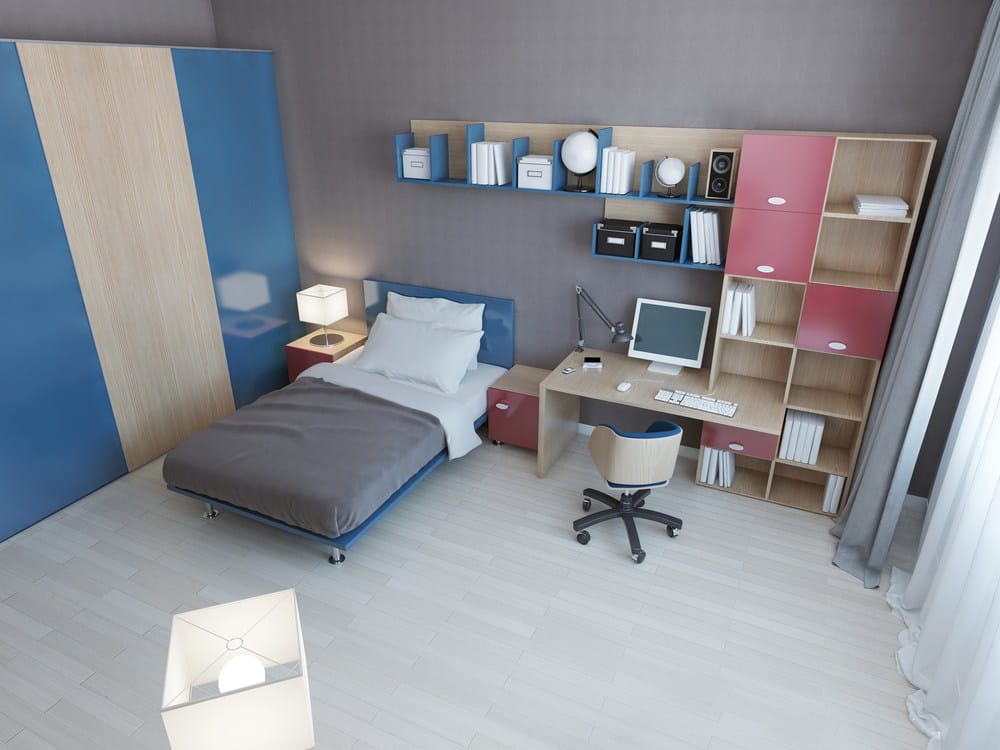 Kids’ bedchamber can be uncluttered, fun, and calming, too. The key is the minimalist design. In this case, the concrete walls and wooden floor effectively highlight the colorful shelving units and orange striped bed cover.
