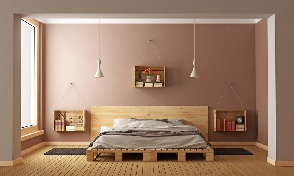 As seen in the picture, the minimalist bedroom is suitable for people with a tight budget. It only employs bed, wooden bedside table, stacked drawers as the nightstand, and some embellishments.