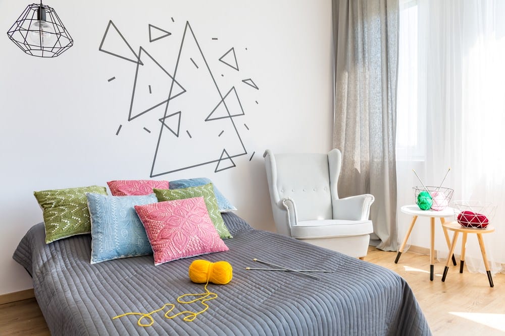 The triangle wall decal and geometric pendant light pair well with the streamlined sleeping area while the white wingback armchair adds a state of sophistication to the room.