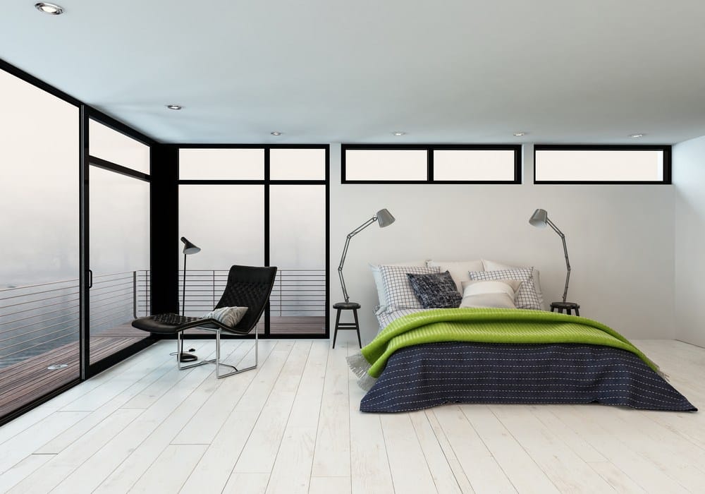 With windows like these, it makes sense to opt for a low bed. This room has so much going on with the artwork and cabinetry that you’ll want something simple in this case. The landscape is too great not to see with such huge windows!