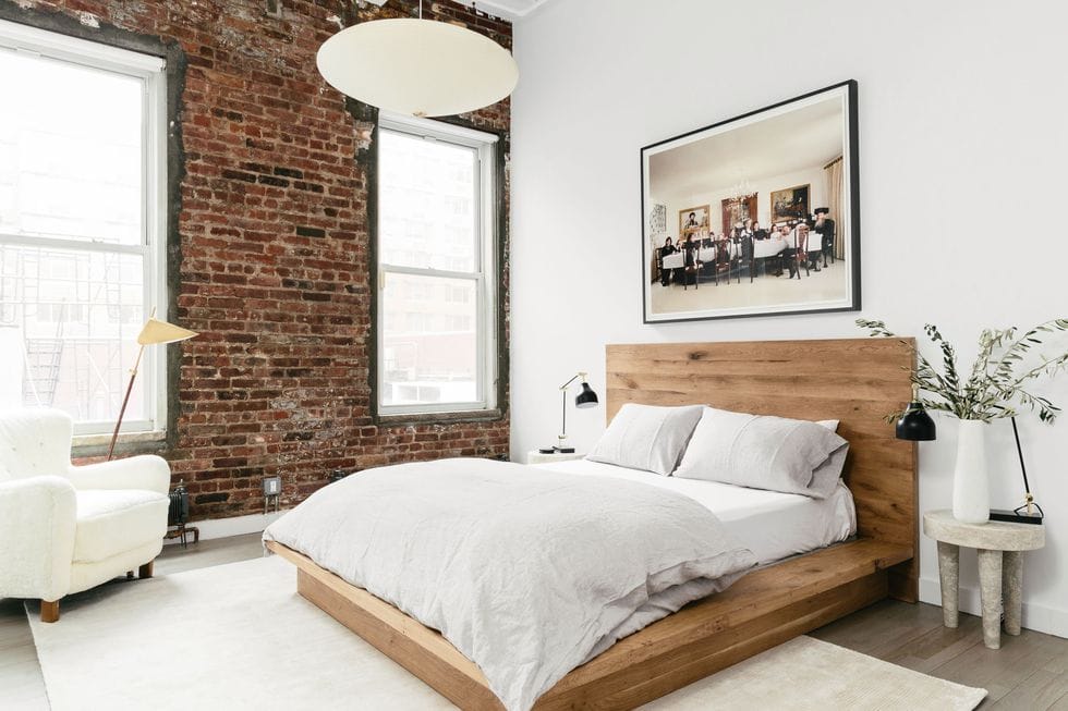 This minimalist bedroom is perfect for someone who likes a modern design and doesn’t mind living in smaller quarters. A simple bed frame made of wood provides the only furniture within this space, while an exposed brick wall offers architectural style that complements any minimalist decorating scheme without clashing too harshly with it.