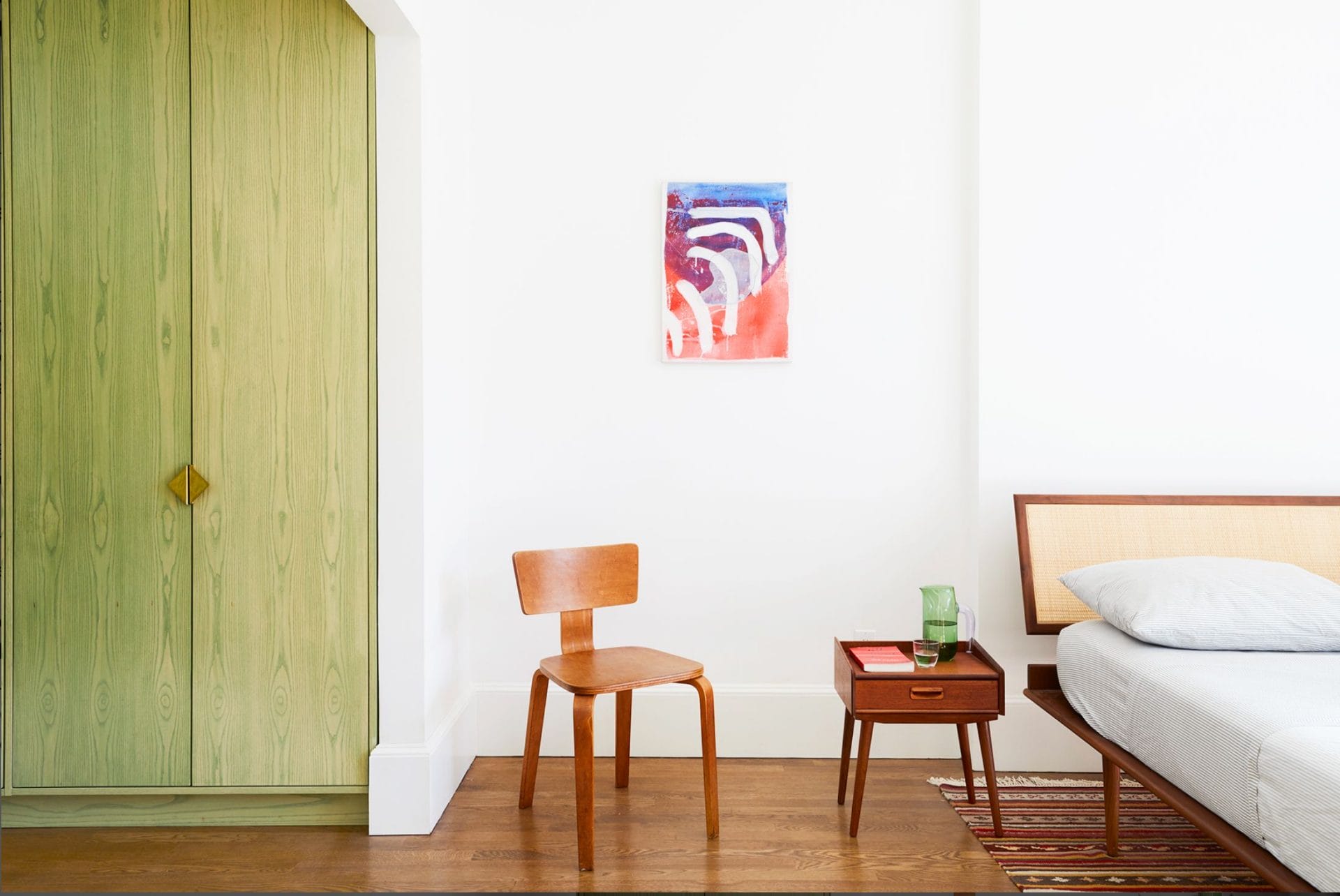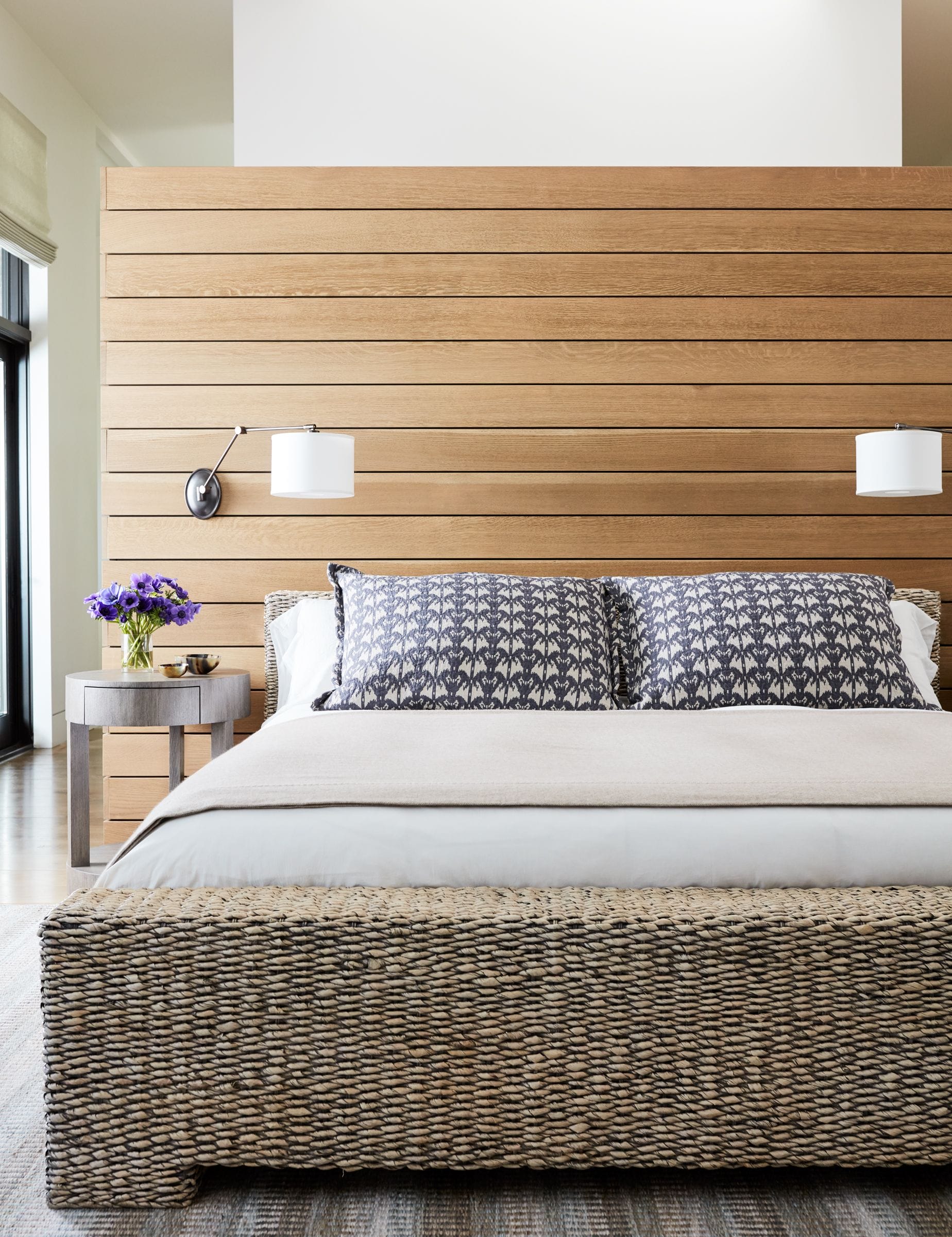 The oak-paneled partition in this minimalist bedroom doubles as a rustic background and wall divider. A rattan bed with natural textures provides the perfect place to sleep while maintaining an earthy, bucolic aesthetic.