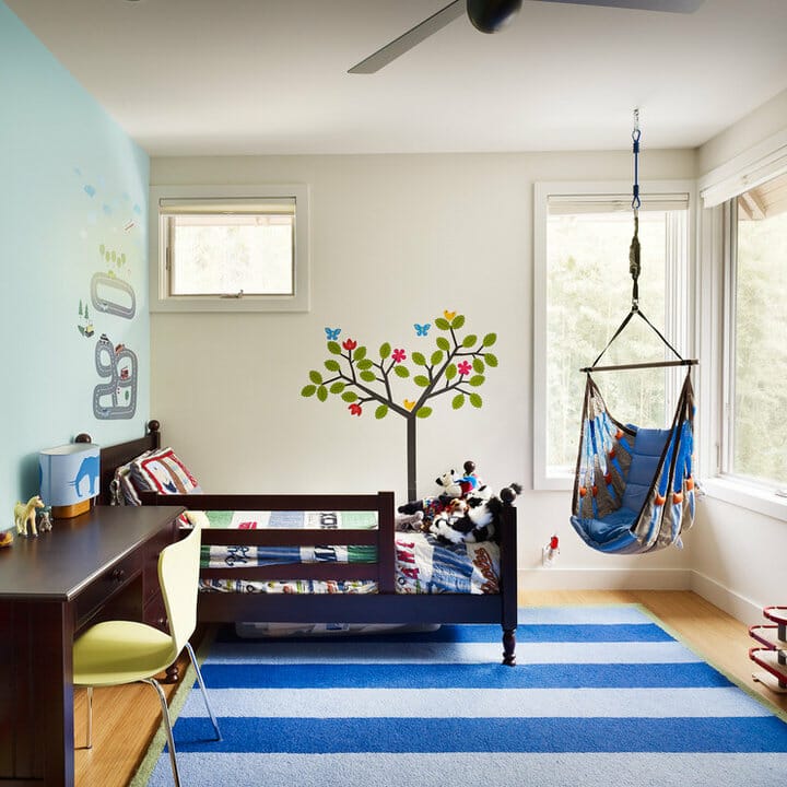 So, imitate the toddler room ideas here using a suspended bed. The hanging part is not intentional to rock your children, but a little bit of swinging sense might help them fast asleep.