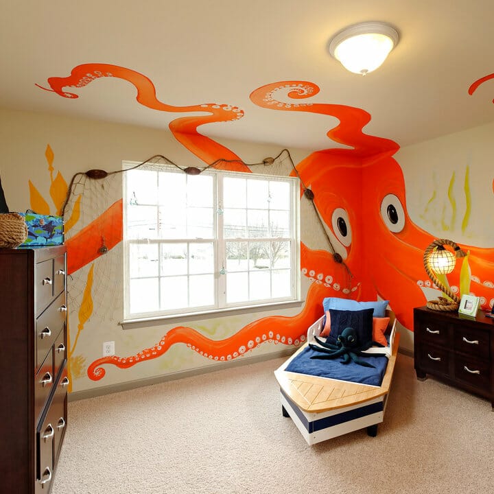 This kids’ bedroom applies toddler room ideas using murals to tell a story and reach the concept of sea life. In detail, the orange hand-painted creature is a giant octopus. Then, your little sailor tries to catch it from the boat using a net stretched on the wall.