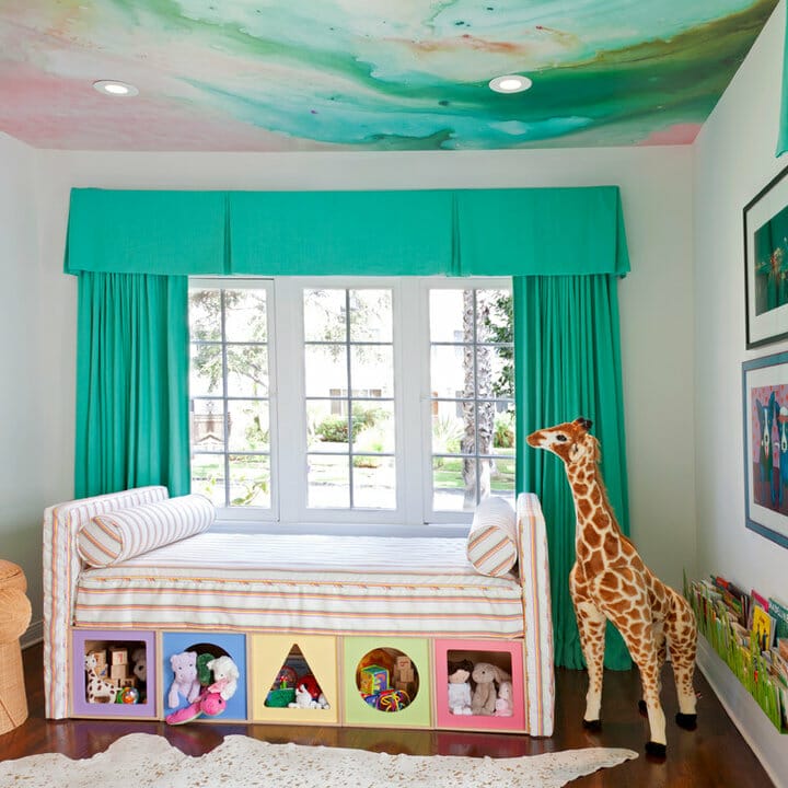 Teal valance, painted ceiling, and bed with toys storage are some of the next toddler room ideas you could duplicate from this nursery.